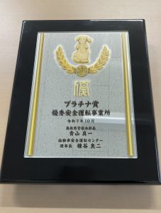 お知らせ 2025/11/18 11月14日(金)鳥取警察署において令和7年第二期優秀安全運転事業所表彰(プラチナ賞受賞事業所)の表彰式が開催され、最高賞のプラチナ賞を受賞しました。 今後も会社全体で安全運転に努めて参りたいと思います。